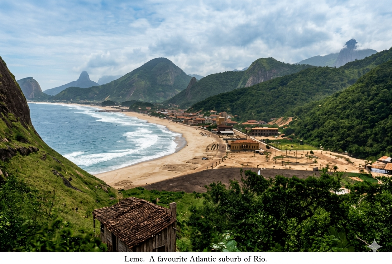 Nesta imagem pode-se ver o bairro do Leme, na zona sul da cidade do Rio de Janeiro, ainda pouco habitada. O prédio ao centro era onde os serviços de bondes vinham do Centro da Cidade e retornavam, inclusive pode-se notar um bonde ao lado deste prédio, na via que atualmente seria a Rua Gustavo Sampaio.
