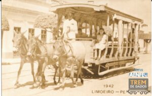 DESCRIÇÃO: Imagem mostrando um bonde Limoeiro, em Pernambuco, ainda com tração animal, no ano de 1942.