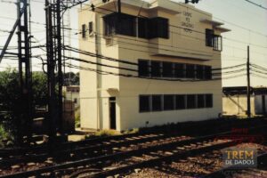 DESCRIÇÃO: Imagem mostrando a cabine de sinalização número 3 da Estrada de Ferro Central do Brasil, situada no bairro do Engenho Novo. Esta cabine foi assumida e administrada pela Associação Brasileira de Preservação Ferroviária – ABPF na década de 1980 e mantida até o ano de 2024, quando infelizmente foi invadida e vandalizada.