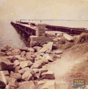 DESCRIÇÃO: imagem do cais metálico de Guia de Pacobaíba, construído em 1926, onde os passageiros realizavam o transbordo entre as Barcas e os trens da Estrada de Ferro Mauá