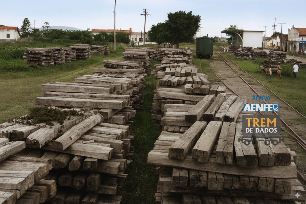 A imagem mostra pilhas e pilhas de dormentes ferroviários acumulados nos arredores da ferrovia e da estação, possivelmente para troca dos mesmos na via permanente da Estrada de Ferro Maricá.