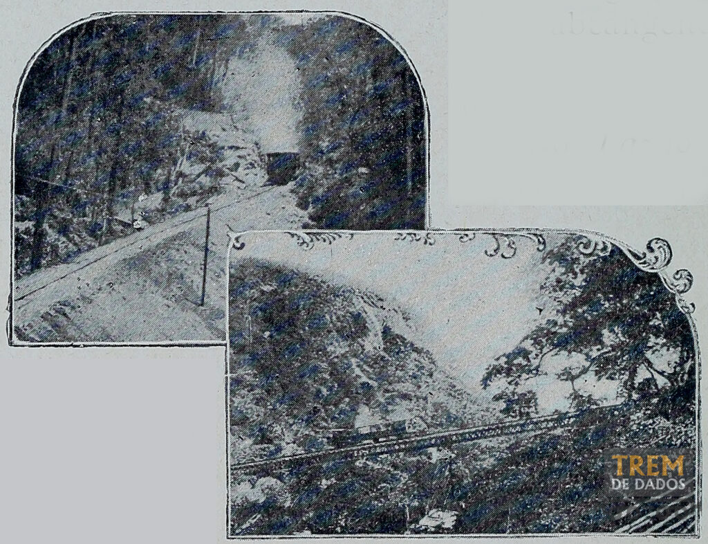 DESCRIÇÃO: Recorte com duas imagens da Estrada de Ferro Corcovado, mostrando à esquerda uma composição em movimento e à direita a Ponte do Silvestre.