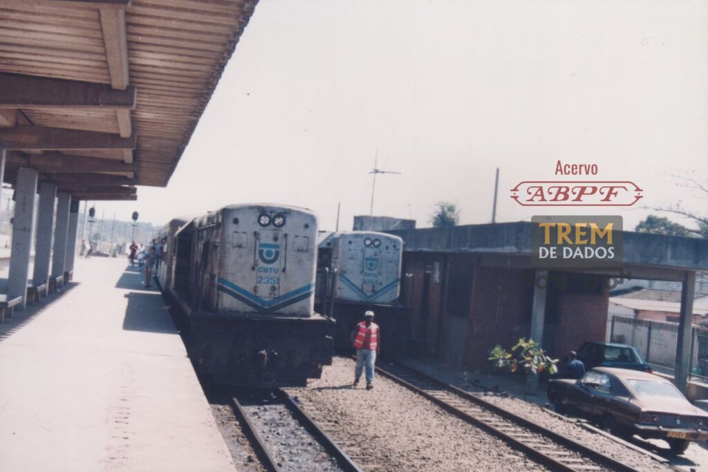 DESCRIÇÃO: Foto mostrando duas locomotivas movidas a diesel, em linhas de bitola métrica, na estação de Gramacho. As locomotivas são de número 2351 e 2364, e faziam os serviços Vila Inhomirim/Raiz da Serra, e Guapimirim