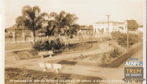 DESCRIÇÃO: Cartão-postal antigo, mostrando a Avenida Artur de Abreu e ao fundo a estação Paranaguá, inaugurada em 15 de novembro de 1883, mas na imagem já com seu prédio inaugurado em 1922. Esta estação fez parte da Estrada de Ferro Paraná (entre 1883 e 1942), e posteriormente Rede de Viação Paraná-Santa Catarina.