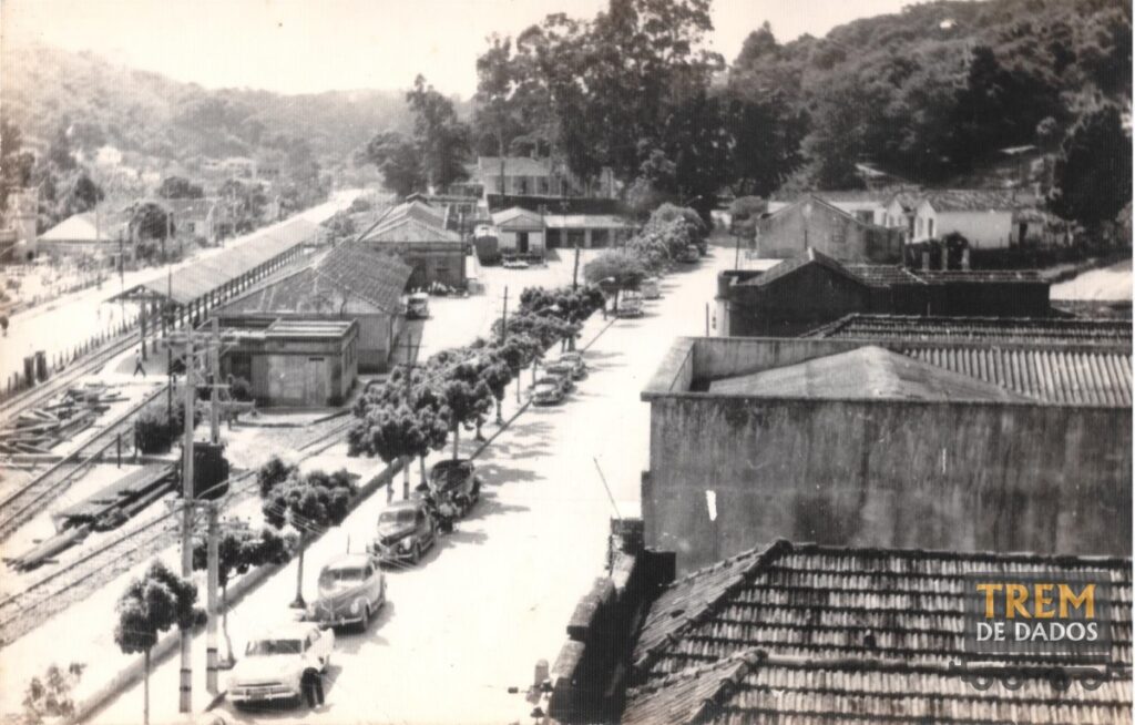 Ainda à esquerda da imagem nota-se as linhas que atendiam a plataforma e o pátio da estação ferroviária, restando atualmente apenas a via do centro, na imagem, que passa entre o prédio da estação e a plataforma.