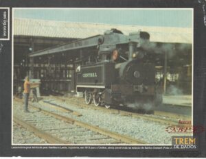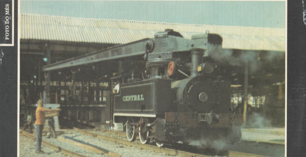 DESCRIÇÃO: Recorte de uma matéria mostrando a “foto do mês”, mostrando a locomotiva-grua fabricada pela empresa inglesa Hawthorn Leslie em 1913 para a Estrada de Ferro Central do Brasil, ainda preservada na estação de Santos Dumont-MG, na ocasião.