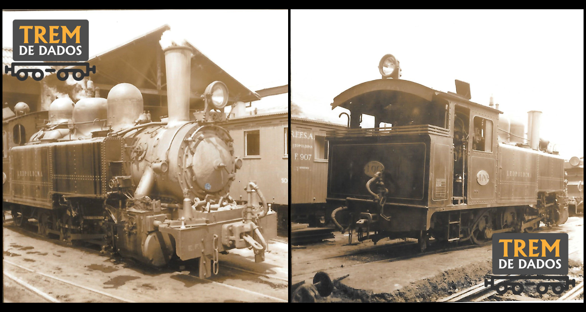Duas imagens unidas em uma, mostrando uma ou duas locomotivas (pode ser a mesma registrada em ângulos diferentes) de sistema Fell da Estrada de Ferro Cantagalo. Uma delas aparentemente ostenta o número 100 na lateral.