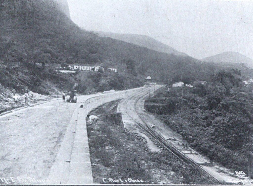 À direita pode-se observar os trilhos da Estrada de Ferro Príncipe do Grão-Pará e a divisão de vias, alcançando mais adiante a estação Meio da Serra, visível ao fundo, na curva.