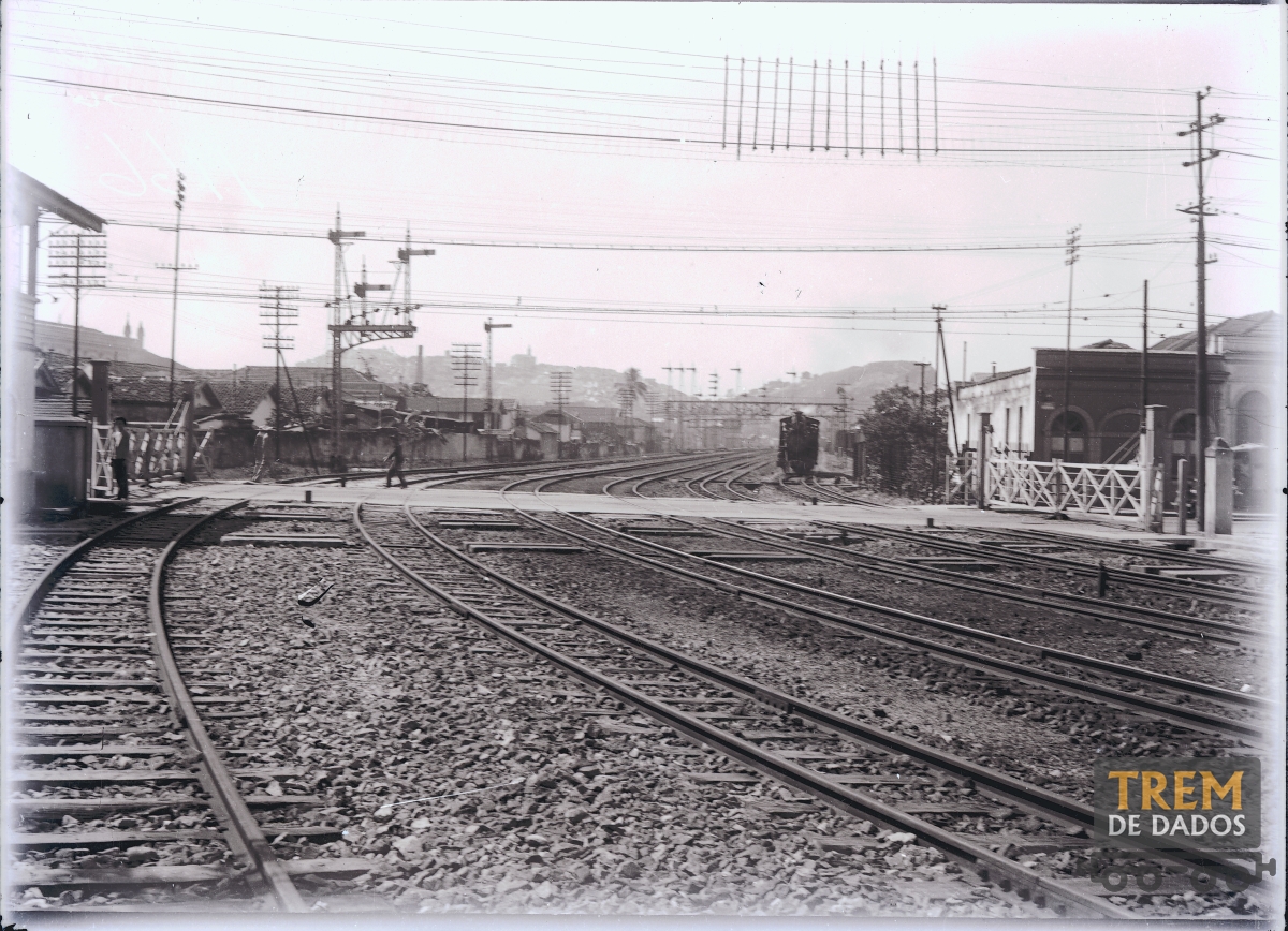 Ao fundo, logo após o cruzamento, vê-se a sinalização que ainda hoje encontra-se no local. Mais ao fundo o relevo próximo à São Diogo, e antes o pórtico de sinais na chegada ao pátio de Barão de Mauá.