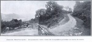 DESCRIÇÃO: Recorte de uma matéria da publicação Automóvel-Club (RJ), na página 40 de sua edição 00014, do ano de 1926, mostrando um cruzamento em nível da Estrada Rio-Petrópolis, atualmente conhecida como Estrada da Serra Velha da Estrela, com a Estrada de Ferro Príncipe do Grão-Pará.