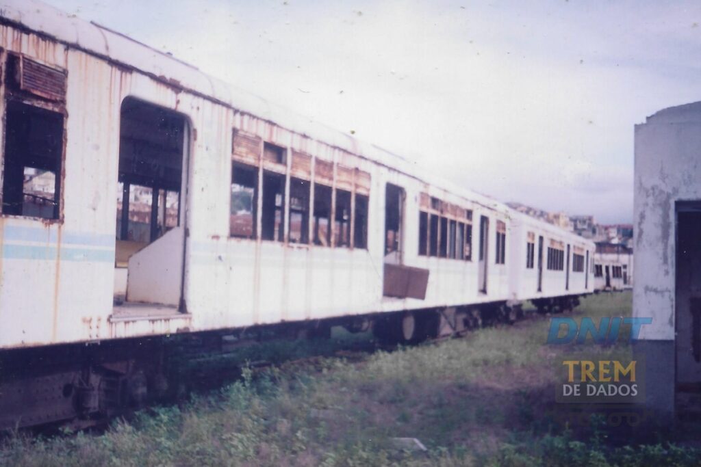 DESCRIÇÃO: Imagem registrada onde ficava a antiga estação de cargas e oficinas de Praia Formosa, mostrando carros de passageiros abandonados no pátio do complexo ferroviário.