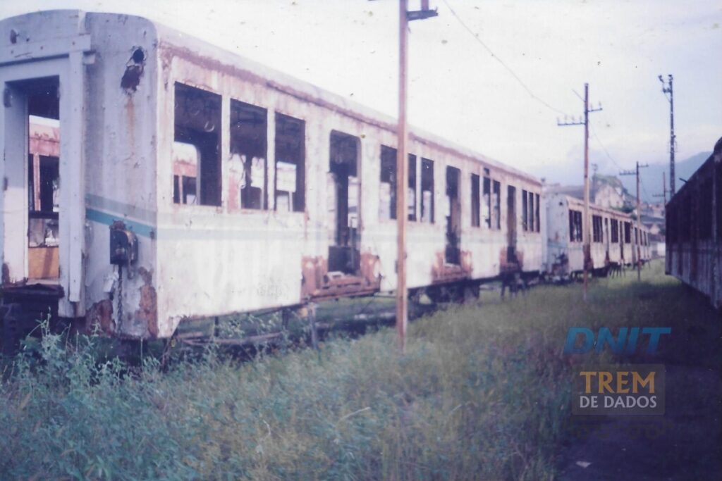 DESCRIÇÃO: Imagem registrada onde ficava a antiga estação de cargas e oficinas de Praia Formosa, mostrando carros de passageiros abandonados no pátio do complexo ferroviário.