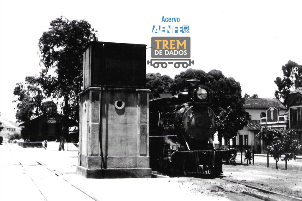 DESCRIÇÃO: imagem mostrando o pátio da estação Sertão, atual Conrado, em Miguel Pereira – RJ. Na imagem pode-se notar um trem com uma locomotiva a vapor estacionada e sendo abastecida ao lado da caixa d’água da estação, e ao fundo, a citada estação.