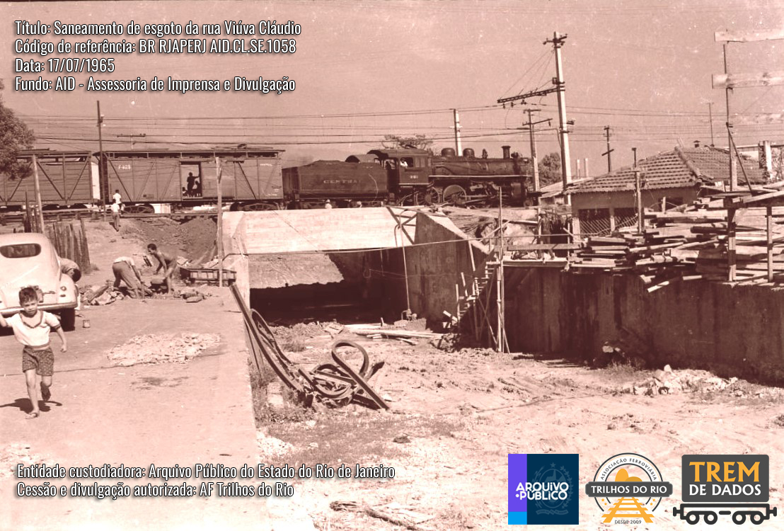 Durante o mandato de Carlos Lacerda, na década de 1960, diversas obras de saneamento foram realizadas na cidade do Rio de Janeiro. Uma delas ficou imortalizada: a obra de saneamento da região dos bairros do Jacaré e de Benfica. Na rua Viúva Cláudio, a construção de uma passagem inferior sob a ferrovia recebeu o sugestivo apelido de "Buraco do Lacerda", em "homenagem" ao governante da época. Posteriormente, e curiosamente, esta obra ficou alagada diversas vezes em ocasiões de chuvas consideráveis. Hoje o Trem de Dados traz um momento raro, possivelmente inédito, da passagem de um trem a vapor neste trecho. Seria da Linha Auxiliar ou da Estrada de Ferro Rio d'Ouro? Esta publicação só foi possível graças à parceria com o Arquivo Público do Estado do Rio de Janeiro (APERJ), que é a entidade custodiadora desta imagem, a qual agradecemos imensamente.