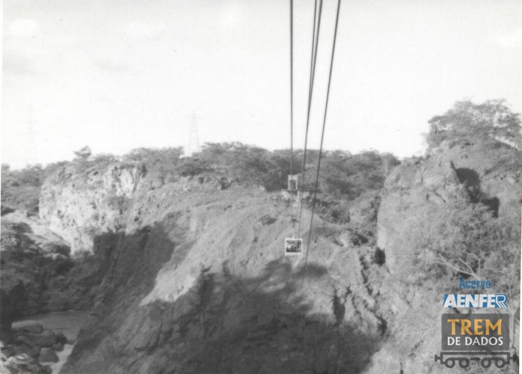 DESCRIÇÃO: Imagem do ano de 1969 mostrando o sistema de teleférico da Cachoeira de Paulo Afonso. Percorrendo 360 metros de distância, à uma altura de 100 metros, através deste sistema era possível apreciar a cachoeira de Paulo Afonso, a ponte metálica, o Salto do Cruatá e a furna do Morcego, onde Lampião se refugiava