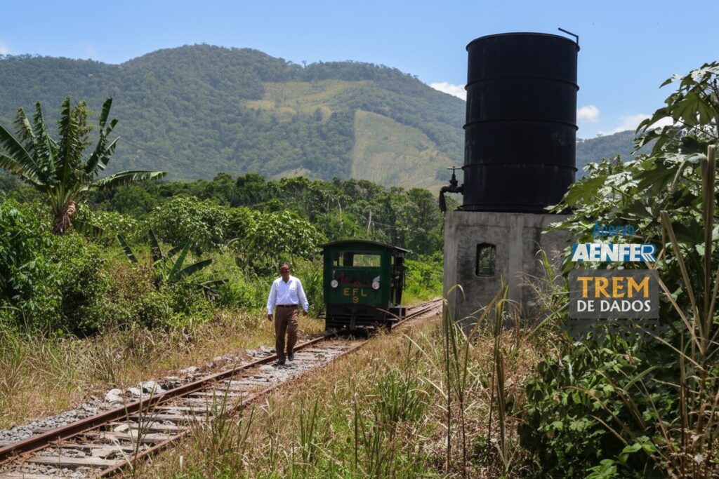 A imagem mostra uma antiga caixa d’água da ferrovia (que ainda utilizava trens tracionados por locomotivas a vapor, por isso a importância de ter reservatórios de água em pontos estratégicos do trecho), e um profissional descendo do Auto de Linha, caminhando e vistoriando alguns aspectos da Via Permanente.