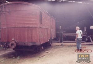 DESCRIÇÃO: Imagem de um vagão da E.F. Melhoramentos do Brasil em Porto Novo – MG, sendo observado pelo saudoso Luís Octávio de Oliveira. Imagem provavelmente da década de 1980.